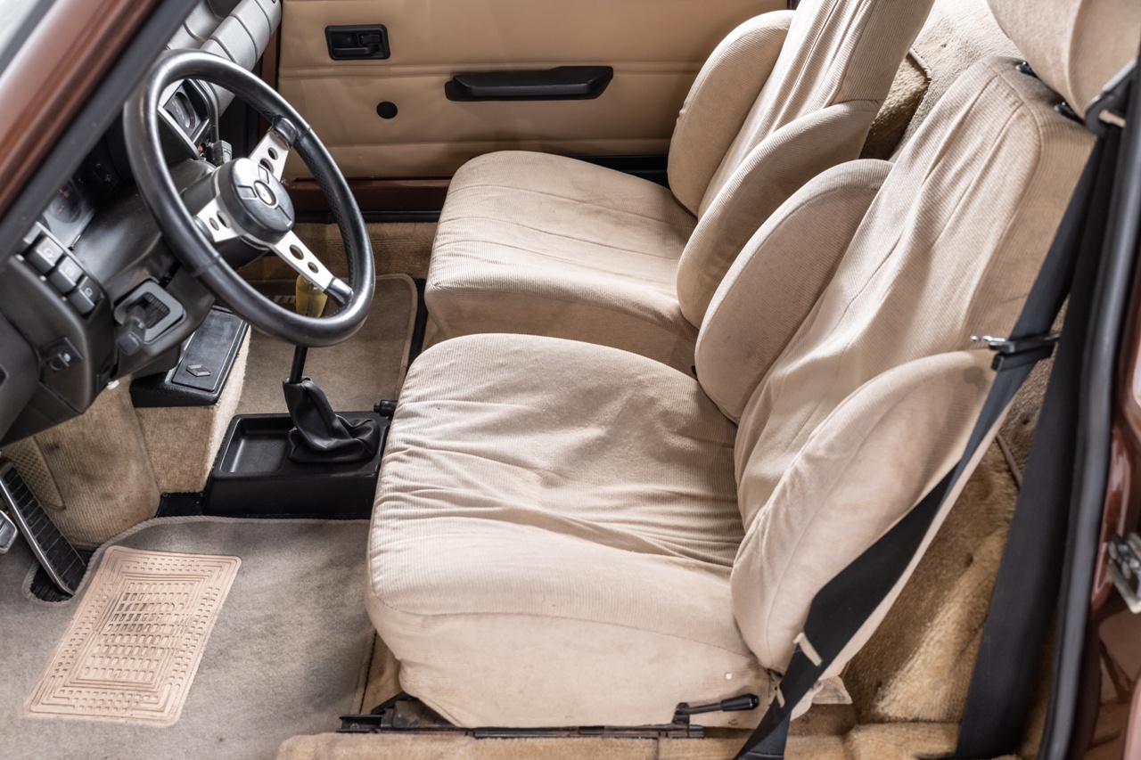 Dentro encontramos tapicería marrón original, un tablero de instrumentos en negro que incluye un volante deportivo de tres radios y un techo corredizo de fábrica. El habitáculo muestra ciertos signos de desgaste en los asientos, volante y palanca de cambios. También en la moqueta que recubre el piso del vehículo. Sin embargo, esto es razonable si tenemos en cuenta que es un coche con 37 años y 142.897 kilómetros recorridos.