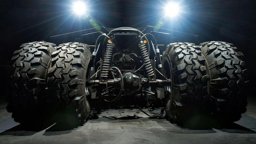 Además, detrás de la estética tan característica del Batmóvil Tumbler se esconde un sistema de faros LED y toda la instalación necesaria para que lance fuego por el propulsor que lleva instalado en la parte trasera (cuenta con dos depósitos de propano para esta función). Los enormes neumáticos delanteros Hoosier son de 18,5 pulgadas, mientras que los traseros de la marca Swamper son de 44 pulgadas. En el interior, un sistema de aire acondicionado, tapicería de cuero, navegador y cámara de marcha atrás componen el equipamiento de esta espectacular réplica.