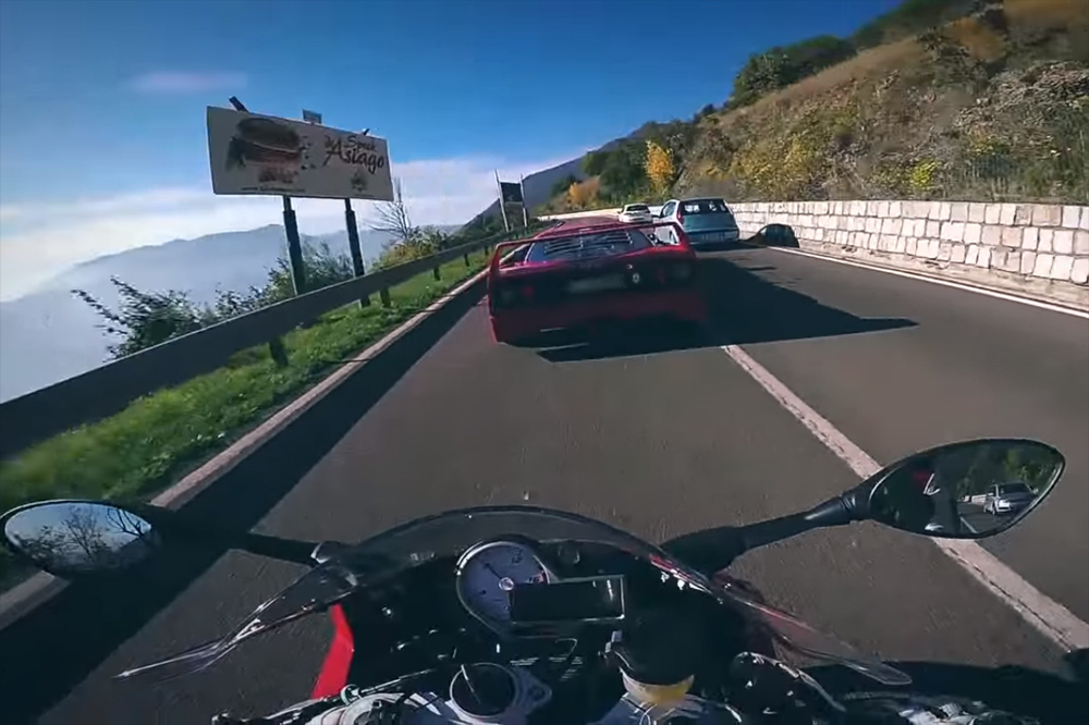 Qué pena que estas imágenes hayan sido grabadas en carretera abierta y con tráfico de por medio, sería otra cosa si ambos vehículos se hubieran medido en un circuito de carreras, un lugar mucho más adecuado para dar rienda suelta a sus poderosos propulsores de estos ‘aparatos’. Y es que una carretera de montaña no es el lugar más adecuado para enfrentar a una BMW S1000RR contra un Ferrari F40, pero eso no fue un impedimento para los conductores de estos dos veloces vehículos.