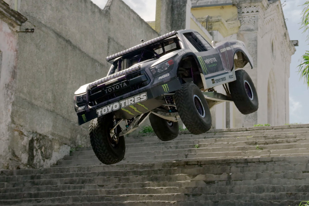 BJ Baldwin es piloto oficial de Toyota y cuenta con el patrocinio de marcas como Monster Energy o Toyo Tires, entre otras muchas. En estas imágenes en las que atraviesa la ciudad cubana con su Trophy Truck de 850 CV, un vehículo de competición que pesa unos 2.800 kilogramos y que cuenta con un chasis extremadamente robusto y con unas suspensiones de largo recorrido en ambos trenes. De hecho, el eje delantero presume de ofrecer nada menos que 66 cm de recorrido vertical, mientras que el tren trasero hace lo propio con unos increíbles 76 cm de recorrido, lo que le permite volar literalmente por encima de casi cualquier obstáculo a velocidades de hasta 233 km/h.