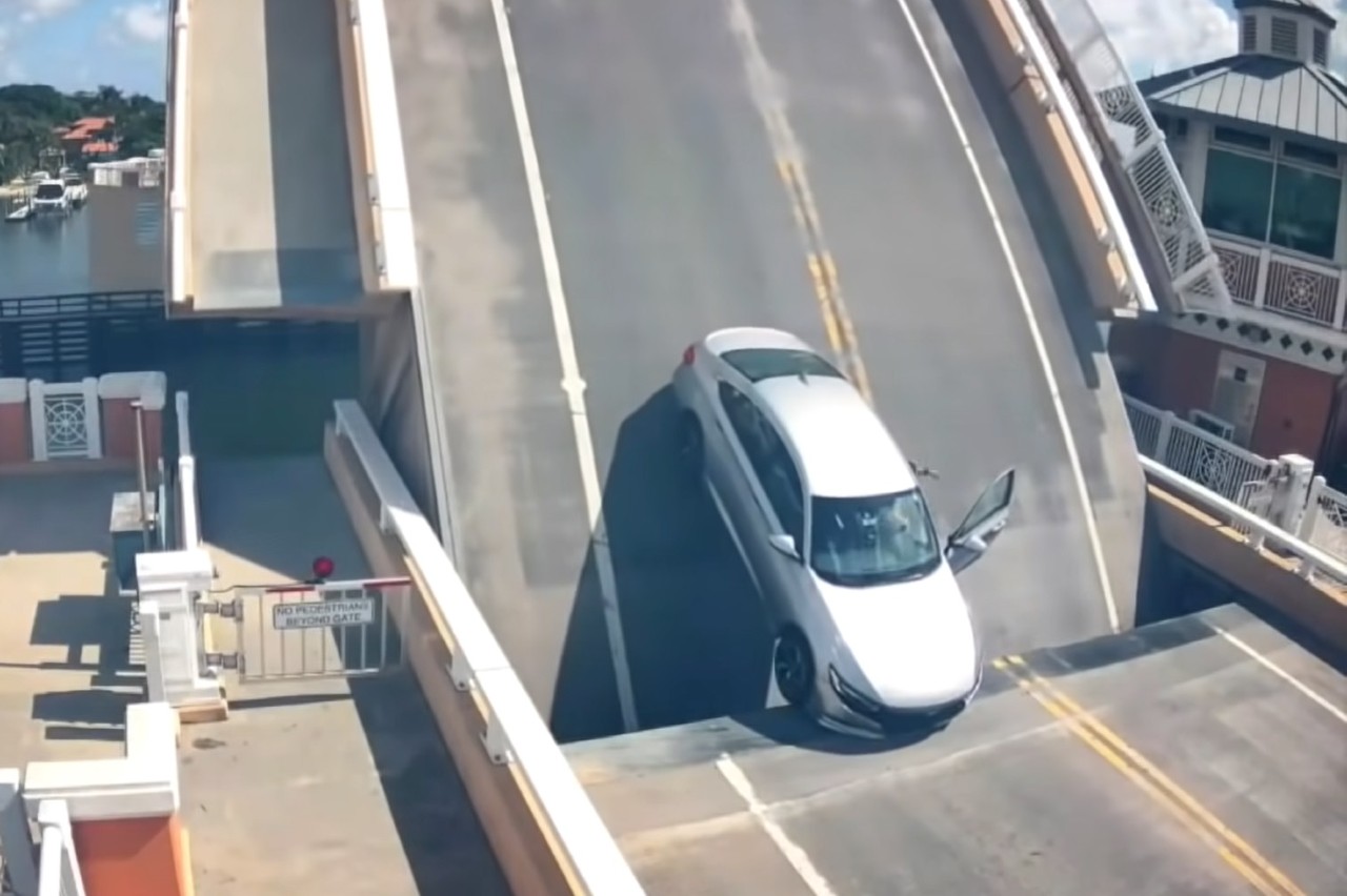 El Accord se queda atrapado y el conductor para el coche. La mala suerte se encuentra en el hecho de que, aún con metros por delante, el piloto deja el vehículo dentro de la sección que se eleva del puente, con solo el voladizo delantero en “tierra firme”. Este pequeño detalle es el que le salvó de tener un accidente grave.