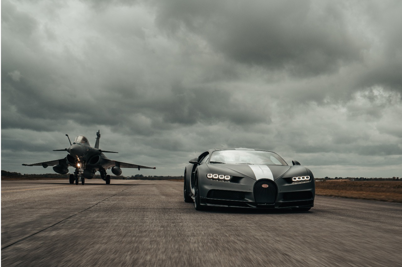 Esta es la 'bestia' que ocupaba uno de los lados de la pista de la base naval de Landivisiau, en Bretaña. La otra, el caza Dassault Rafale Marine, con sus 58,550 newtons de fuerza (equivalentes a 5.727 CV) y 1.975 km/h de velocidad punta, incluso lo ensombrece en lo que a cifras brutas se refiere. Dos maravillas de la ingeniería guiadas, además, por dos profesionales. El Bugatti estaba conducido por Pierre-Henri Raphanel, piloto oficial de la marca, y a los mandos del avión se encontraba el capitán Etienne de la Fuerza Aérea gala.