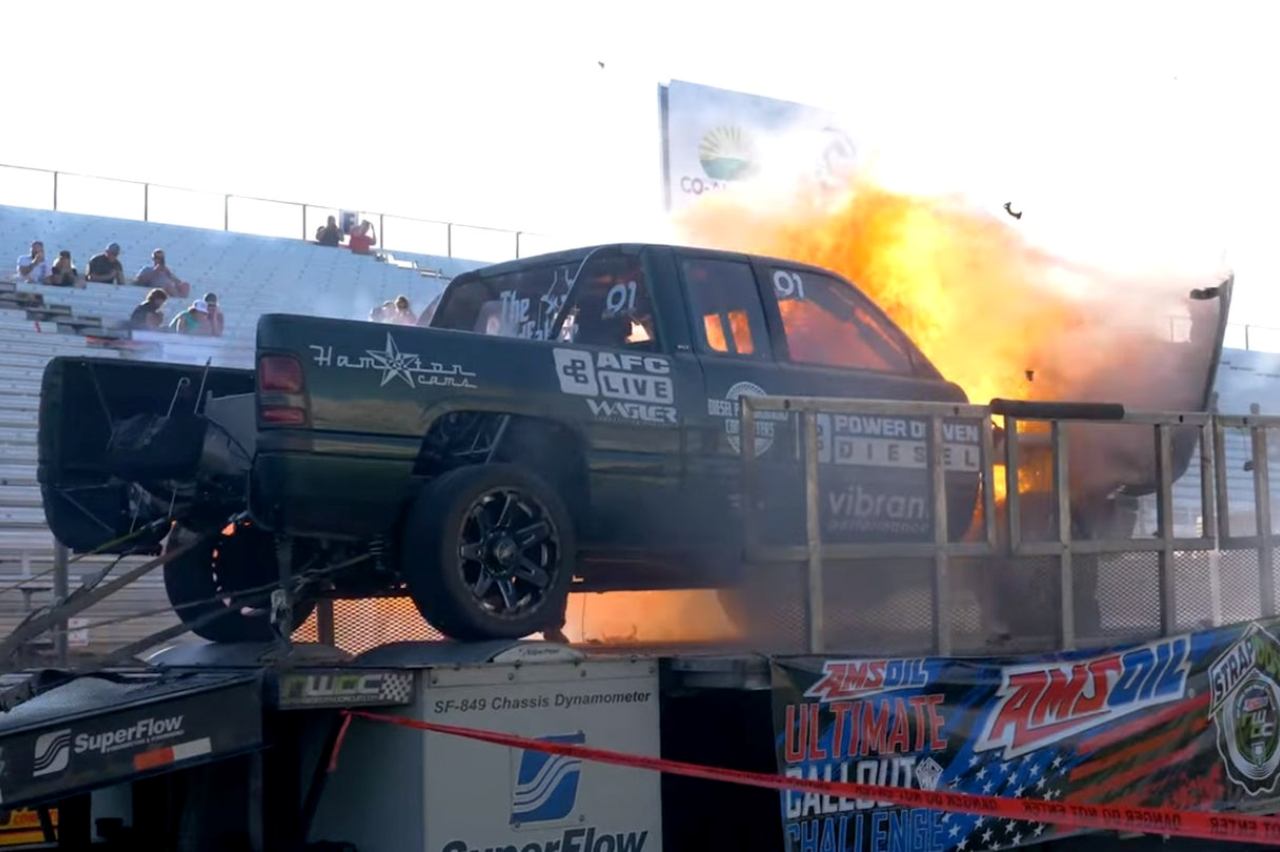 Cuando un motor se lleva al extremo, comprometiendo su integridad estructural, pueden ocurrir cosas como las del siguiente vídeo. En el clip más abajo verás como el motor Dodge Cummins de 2.700 CV de esta pick-up explota en el banco de potencia durante una prueba. Aunque, en realidad, fue la segunda vez en un mismo fin de semana en la que la mecánica de esta camioneta saltó por los aires.