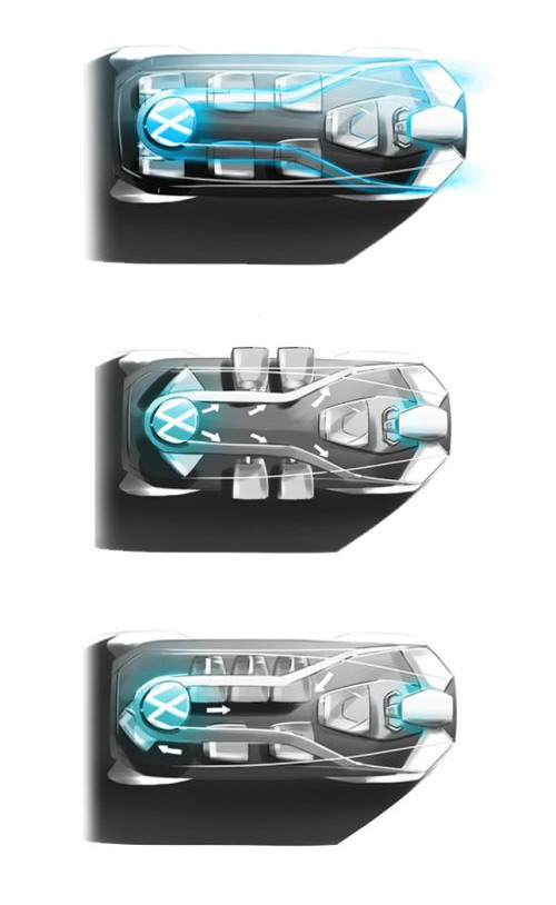 El prototipo se caracteriza por sus líneas horizontales, parabrisas panorámico, llantas de aleación oscurecidas y de grandes dimensiones y pilotos de gran tamaño. Por su parte, el habitáculo, tremendamente futurista, puede a albergar hasta a siete pasajeros. Por cierto, las banquetas tienen gran amplitud de movimiento -como podrás comprobar en los bocetos-.