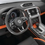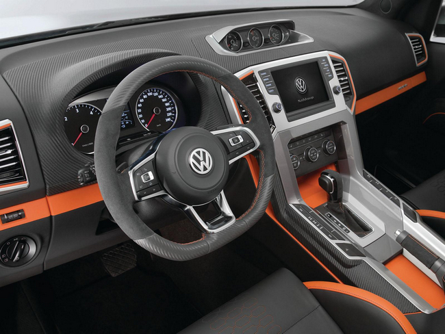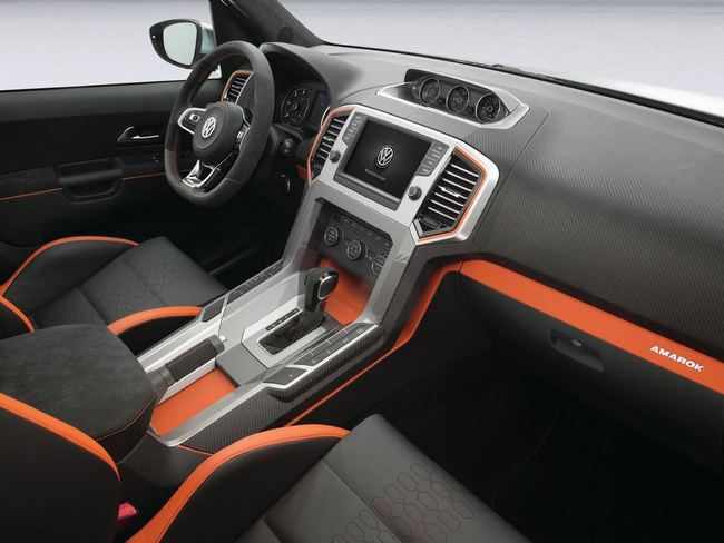 En el habitáculo, los asientos tipo ‘backet’ del Volkswagen Amarok Power Pickup Concept también son iguales, aunque la tapicería cuenta ahora con detalles en naranja en lugar del rojo del modelo del año anterior. Sin embargo, lo que sí es exclusivo de este prototipo es el potente equipo de sonido de 5.000 vatios de potencia.