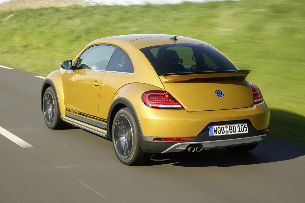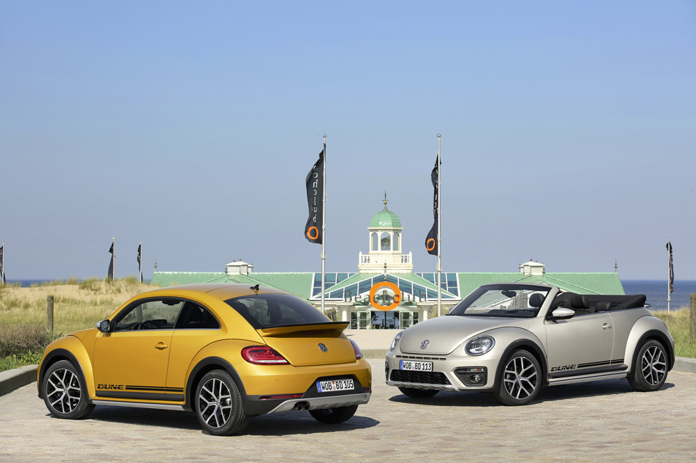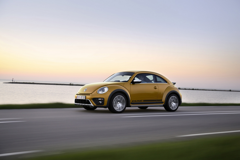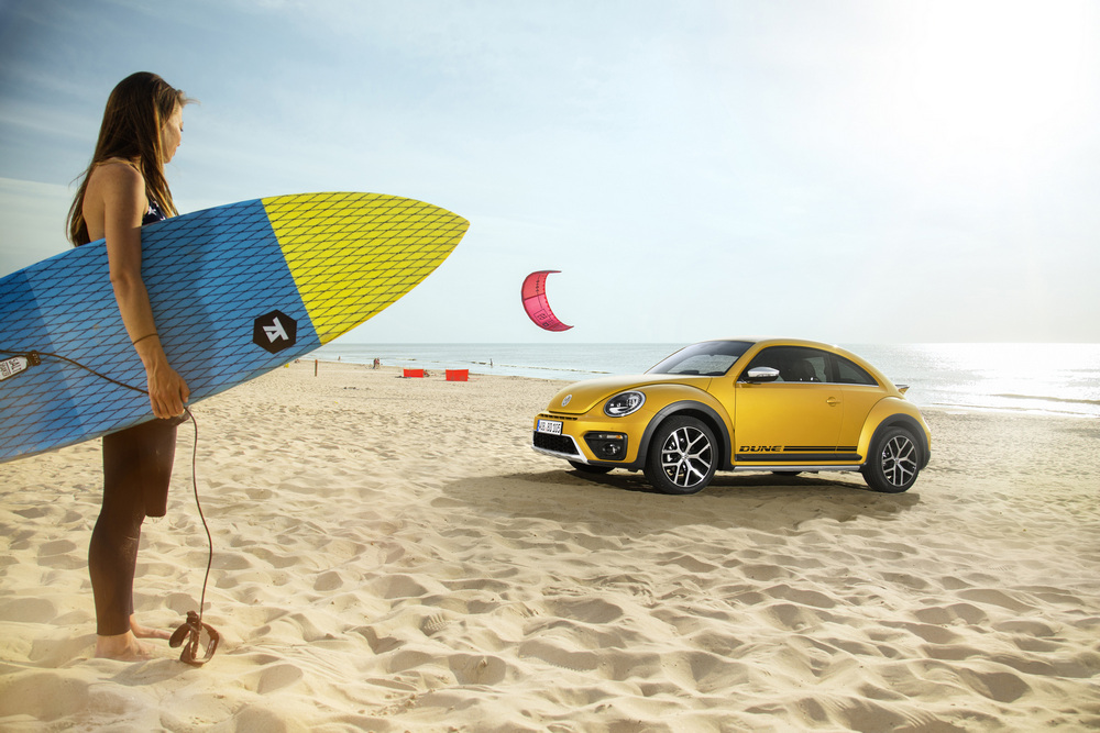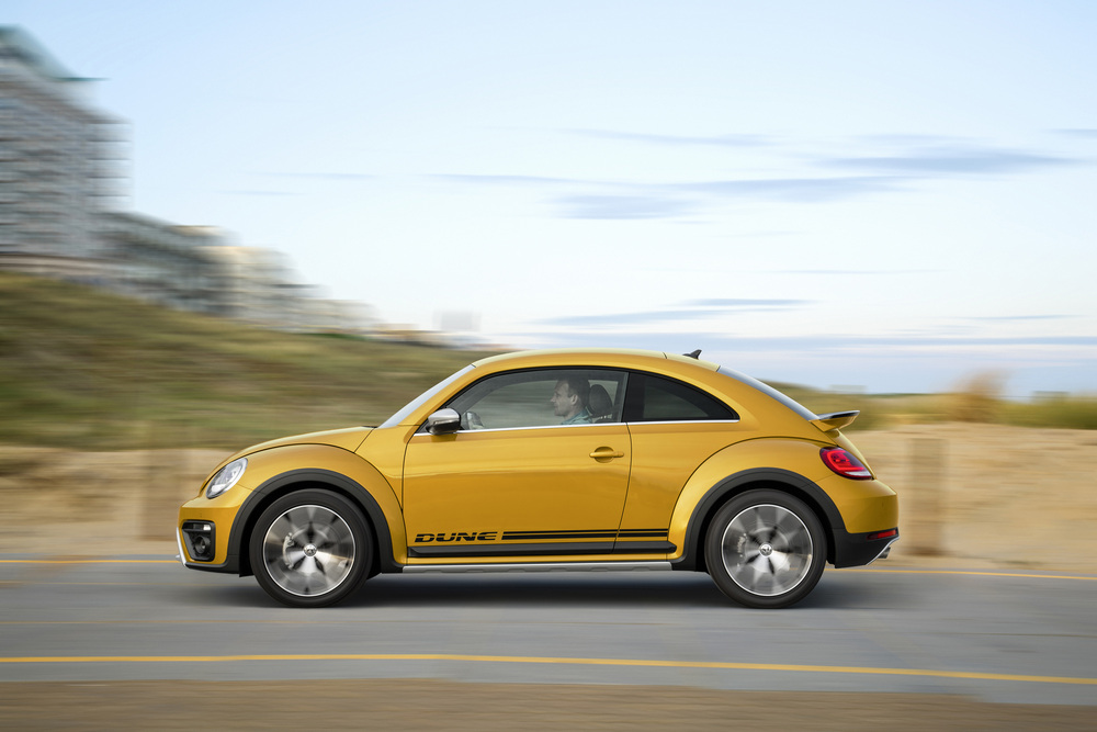 Otros puntos destacados en el Volkswagen Beetle Dune 2016 son la altura de la carrocería, unas vías ligeramente más anchas y las llantas de 18 pulgadas estilo 'Canyon' con neumáticos aptos para todas las estaciones. En cuanto al equipamiento, se basa en el acabado Design del Beetle sobre el que añade el encendido de luces automático con luz de conducción diurna, asientos deportivos delanteros calefactables con apoyo lumbar, el espejo de cortesía iluminado, las dos lámparas de lectura delanteras, el control automático de la velocidad, el retrovisor interior antideslumbrante automático, el sensor de lluvia y los sistemas "ParkPilot" y de arranque en pendiente.