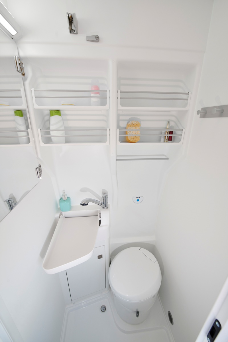 El Grand California está basado en el Crafter y esto le permite disfrutar de un baño completo con inodoro, lavabo de tapa elevable, varios estantes, un armario con luz y un plato de ducha con dos desagües. Su depósito puede acumular hasta 110 litros de agua para el baño y la cocina, e incorpora un tanque de aguas residuales con 90 litros.