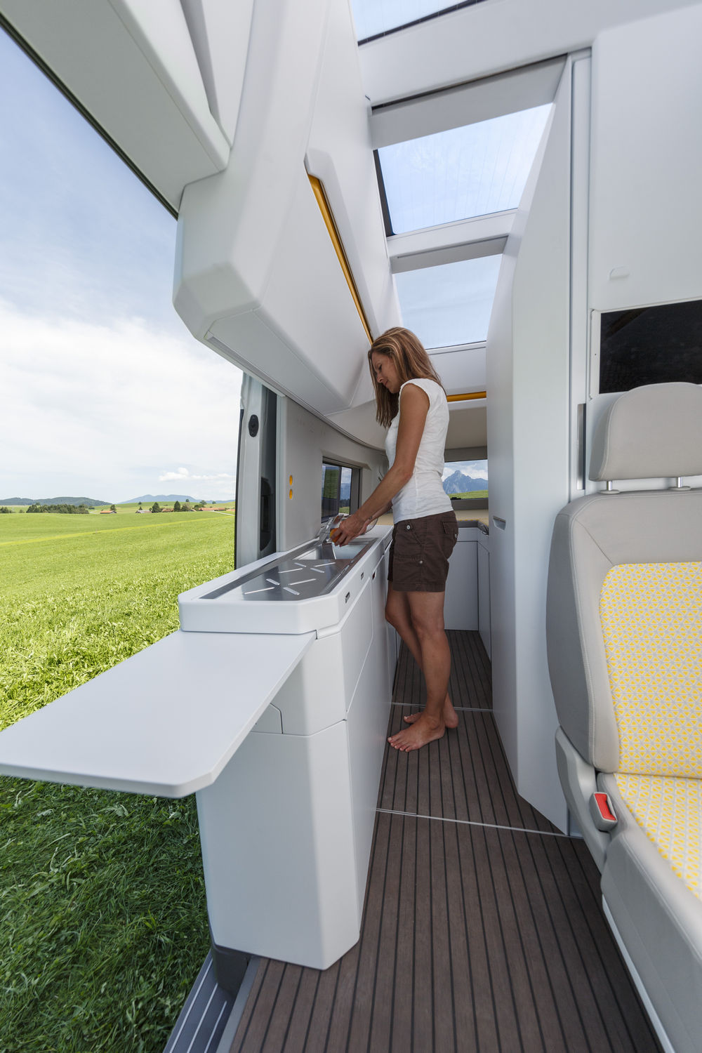 A pesar de la mayor altura, 2,9 metros, Volkswagen asegura que su coeficiente aerodinámico es prácticamente el mismo que el Crafter. Ese avance se ha conseguido con unas hendiduras creadas en el techo que facilita el flujo del aire. Además, cuenta con tracción a las cuatro ruedas y una suspensión neumática, por lo que es capaz de enfrentarse a todas las estaciones del año. Este último elemento sirve también para nivelar con mayor facilidad el vehículo al estacionar.