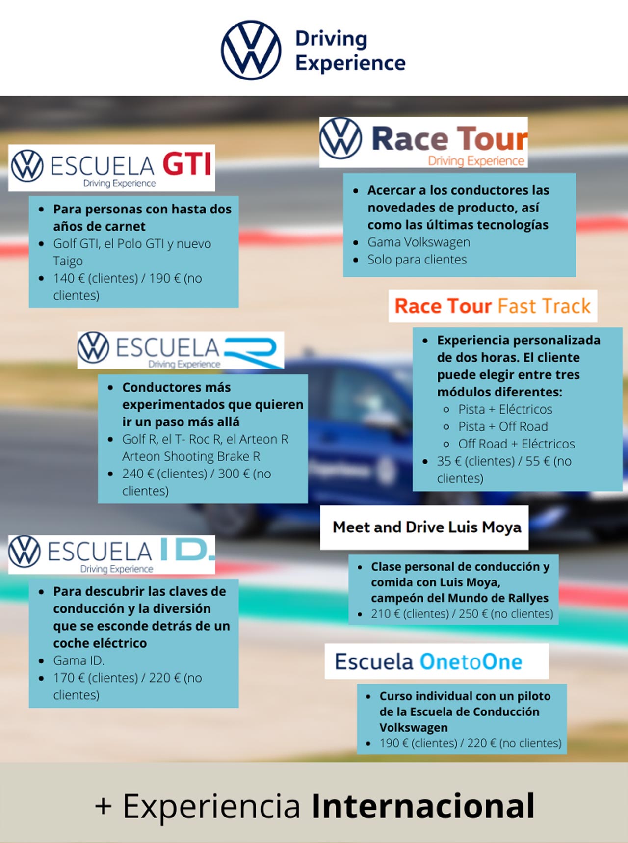 Todo ello en un entorno seguro, pues estos cursos se desarrollan en circuitos tan emblemáticos como Montmeló, Jarama, Los Arcos, Ascari o Cheste, entre otros; y con el apoyo de los mejores profesionales del sector, con instructores de primer nivel como Luis Moya, bicampeón del mundo de rallyes y embajador de Volkswagen.
