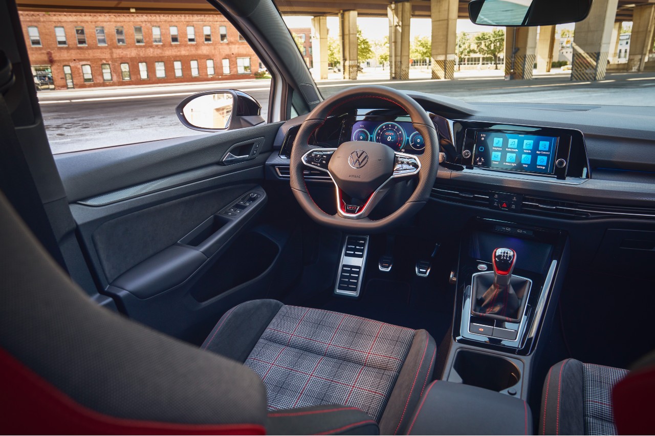 En el interior, el pomo de la palanca de cambios, inspirado en una pelota de golf, se sitúa entre los asientos, un elemento característico del modelo desde sus inicios. En los acabados GTI S y GTI SE, son serie los clásicos asientos de tela Scalepaper Plaid. Los asientos de cuero Vienna son de serie en el acabado Autobahn y opcionales en el SE.