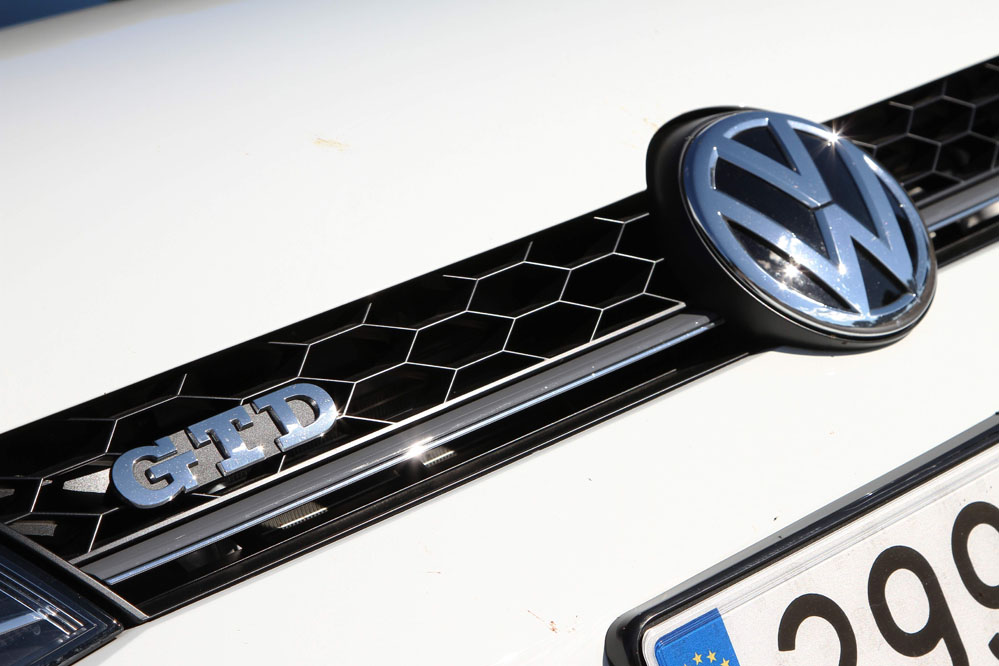 Además, el color de la carrocería destaca con el amarillo limón de las pinzas de freno, los intermitentes laterales situados encima de las aletas delanteras, la ‘R’ de la parrilla y la línea que atraviesa ésta y que une los dos faros –en el Golf GTI es roja (prueba del Volkswagen Golf GTI MK7), en el GTD (prueba del Volkswagen Golf GTD MK7) es gris oscura, en el R es plateada y en el e-Golf (prueba Volkswagen e-Golf), azul-. (Comparativa: Golf GTI contra Golf GTD)