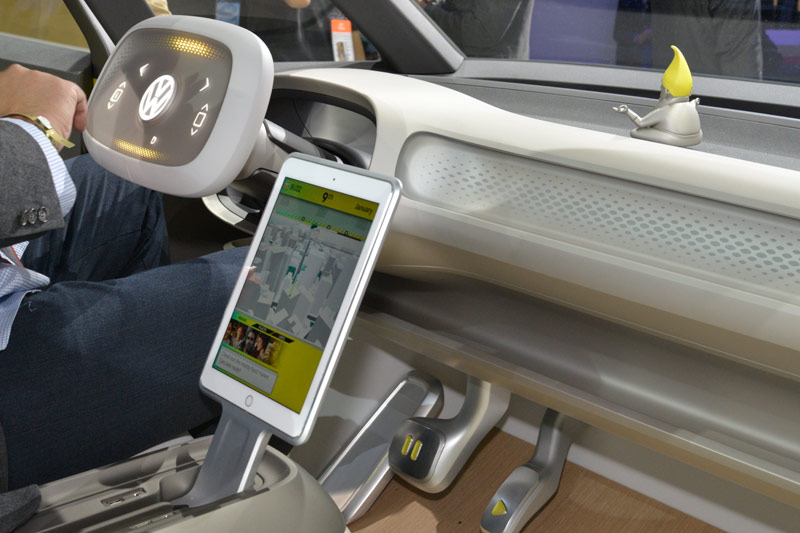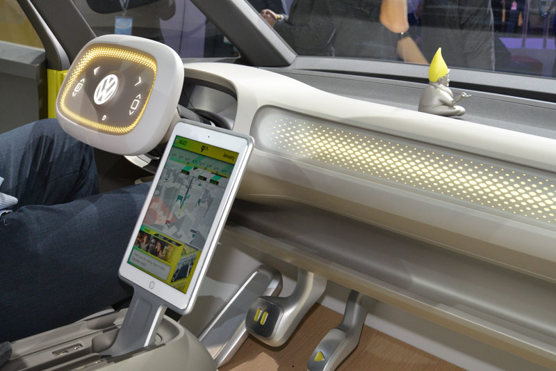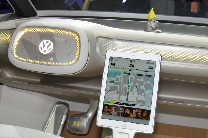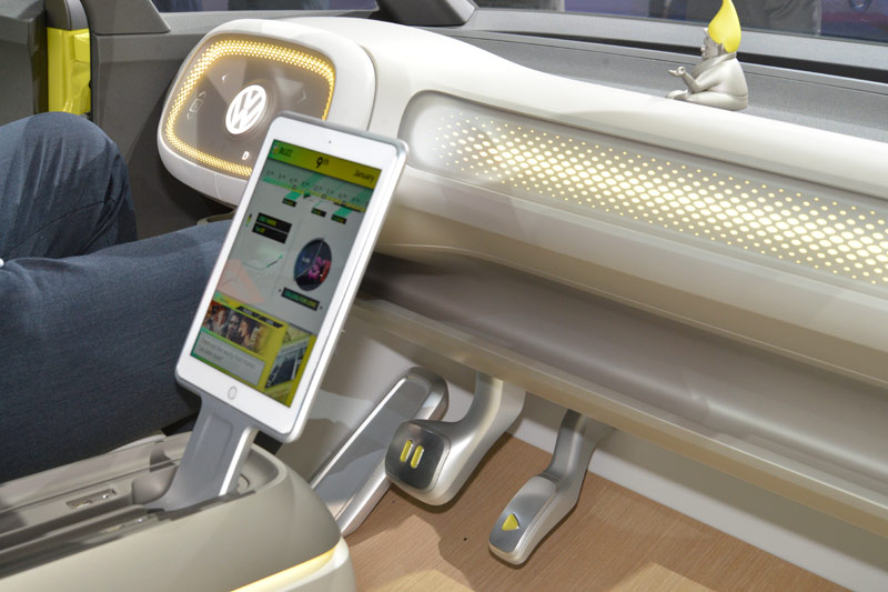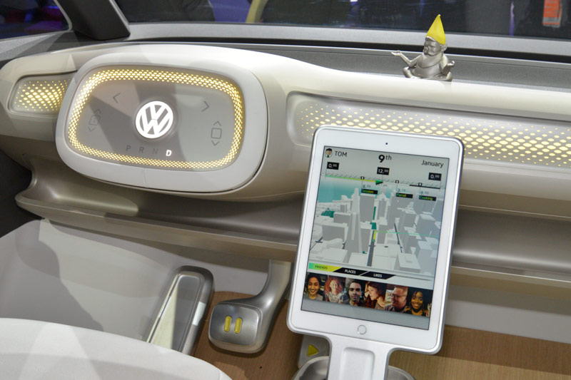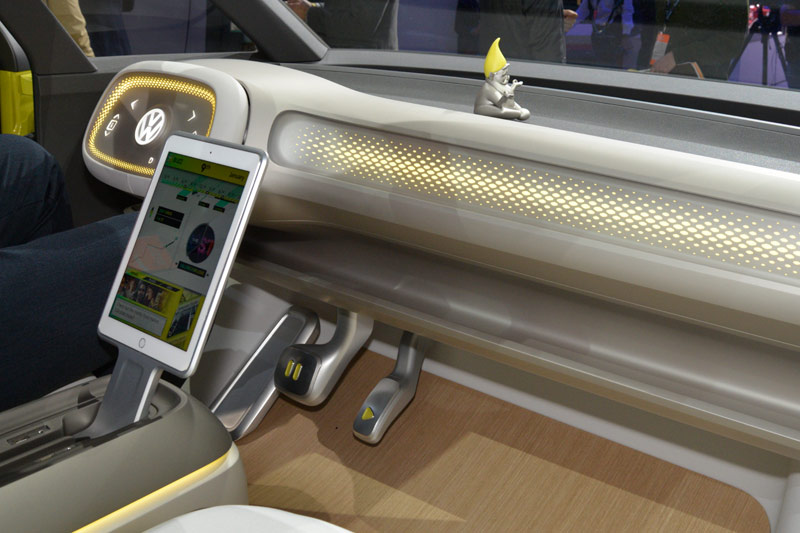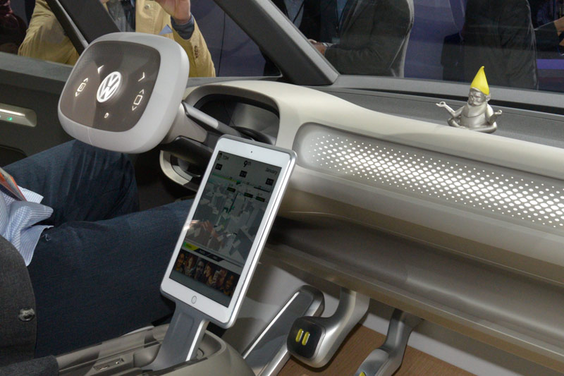 Este prototipo, el Volkswagen I.D. BUZZ, también ha querido mostrar una imagen desenfadada, muy ‘flower power’. Para sorpresa de los allí presentes, el primer día de la muestra, una figura de una mujer con un instrumento musical y una falda hawaiana estaba plantada en el salpicadero. Lo extraño, pero también divertido, es que al día siguiente esa música 'hizo las maletas' y su lugar fue ocupado por un gnomo en posición budista.