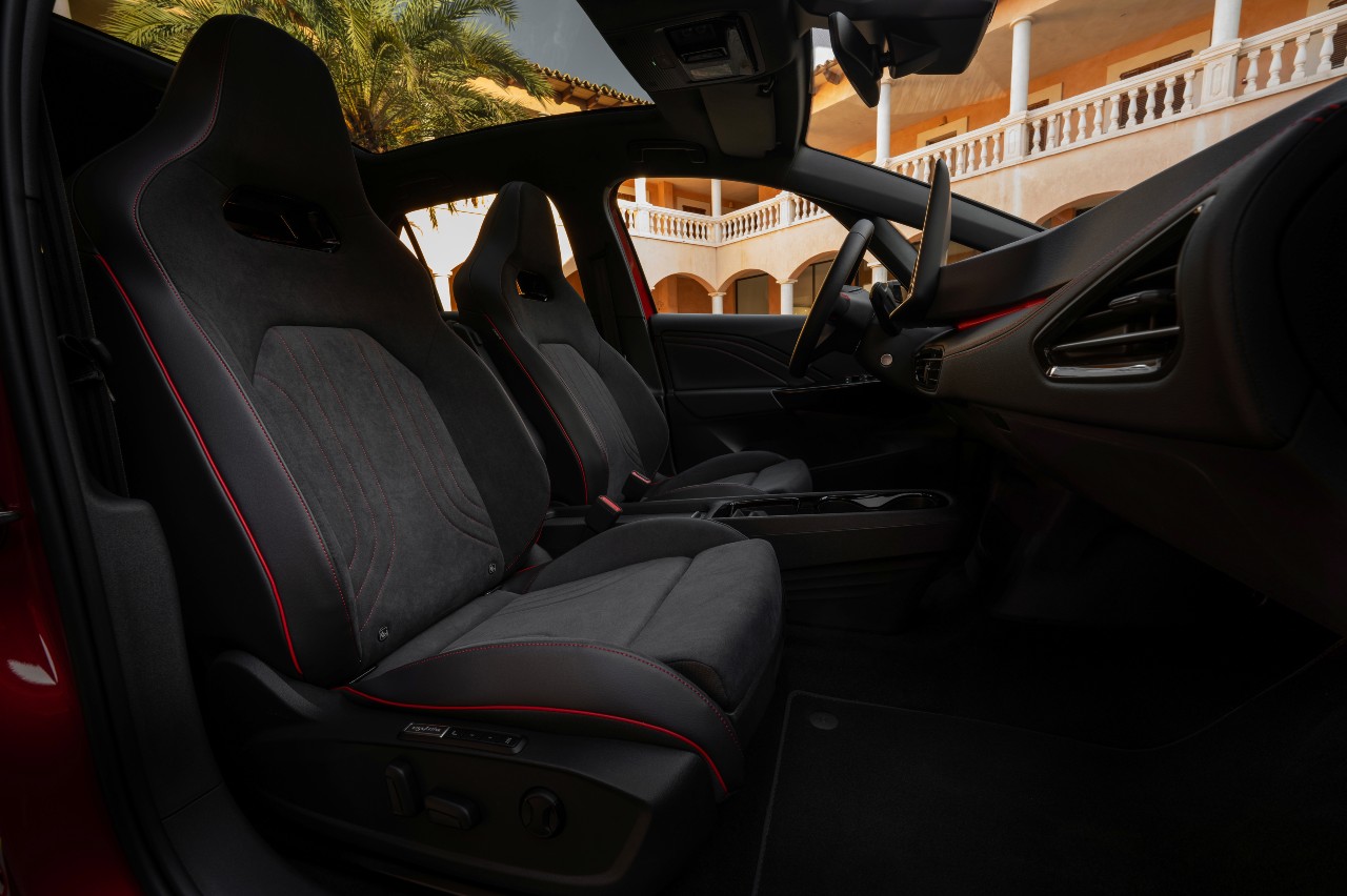 Dentro del ID.3 GTX, encontramos un interior deportivo y muy personalizado. De serie, tiene unos asientos deportivos con regulación eléctrica y tapizados en una mezcla de tejido y cuero sintético, con una modulación ergonómica, costuras decorativas rojas y el logo GTX perforado en los respaldos delanteros. Opcionalmente, también están disponibles asientos ergoActive personalizados en diseño GTX. tapizados con microfibra ArtVelours Eco oscura.