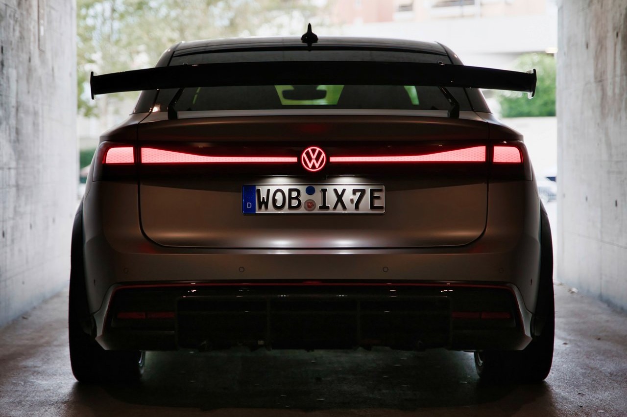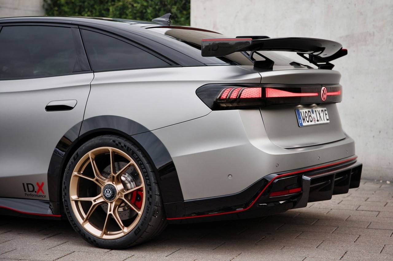 Empezamos por el aspecto de la berlina eléctrica alemana. En el exterior encontramos numerosos elementos que demuestran el carácter deportivo del ID.X Performance, como el splitter delantero el difusor trasero de carbono. Luce unas llantas de 20 pulgadas con una tuerca central monoblock, envueltas en unos neumáticos de competición de 265. Atrás, llama la atención alerón de carbono, que garantiza la carga aerodinámica necesaria, mientras que las ópticas traseras tintadas acentúan el aspecto deportivo de la berlina eléctrica.