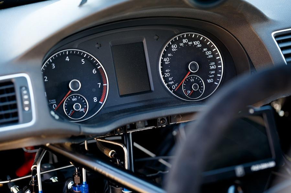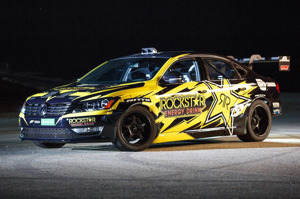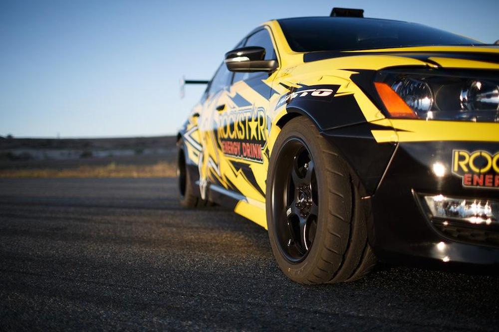 El Volkswagen Passat de Fórmula Drift que pilotará Tanner Foust luce la clásica decoración exterior de una marca de bebidas energéticas, unas aletas ensanchadas y un enorme alerón sobre el portón del maletero. Además, equipa nuevas llantas de aleación KMC de cinco radios con neumáticos Nitto NT05. Pero aparte de esto, su aspecto básicamente es idéntico al del Passat estadounidense.