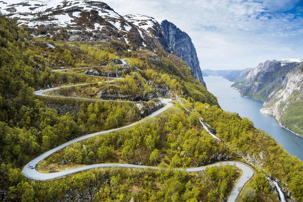 La carretera (de ensueño) cuenta con un total de 27 horquillas a lo largo de los 29 kilómetros que la componen, por lo que el Volkswagen ganador del Campeonato del Mundo de Rally 2014 se muestra en su hábitat natural. Según ha comentado Mikkelsen: "El fiordo, las laderas empinadas, los altos bancos de nieve, el sinuoso camino..., conducir aquí es un sueño". No te pierdas el vídeo a continuación.