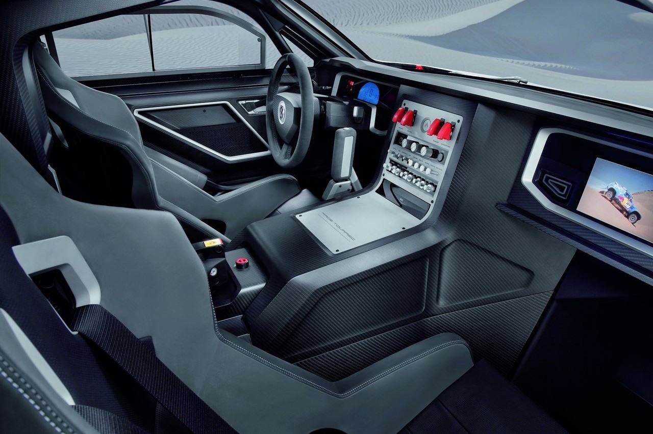 Lógicamente, los mayores cambios se dieron en el interior, donde sólo se respetó la jaula antivuelco. El diseño del habitáculo estaba basado en el avión F-117 Nighthawk y cuenta con unos exclusivos asientos básquets Recaro con arneses, una tapicería que combina el cuero napa y nobuk y molduras en fibra de carbono. En homenaje al Rally Dakar, las victorias del Dakar están grabadas en el aluminio anodizado de la consola central, justo al lado de la firma ‘Race Touareg’.