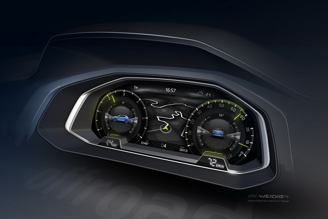 Esa distancia entre ejes permite que el prototipo T-ROC disponga de un habitáculo con capacidad para cuatro pasajeros. El cuadro de mandos está integrado por una pantalla a color de 12,3 pulgadas que es capaz de variar la información y el diseño que ofrece al conductor en función del modo de conducción elegido -‘Street’, ‘Offroad’ y ‘Snow’-. Por ejemplo, en modo todoterreno -Offroad-, el velocímetro sólo muestra velocidades de hasta 80 Km/h en lugar de los 260 Km/h que exhibe cuando se encuentra en modo ‘Street’.