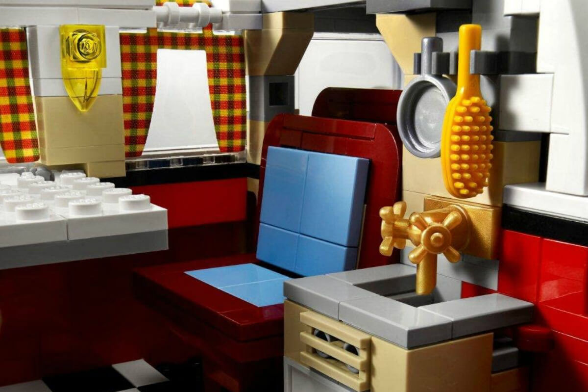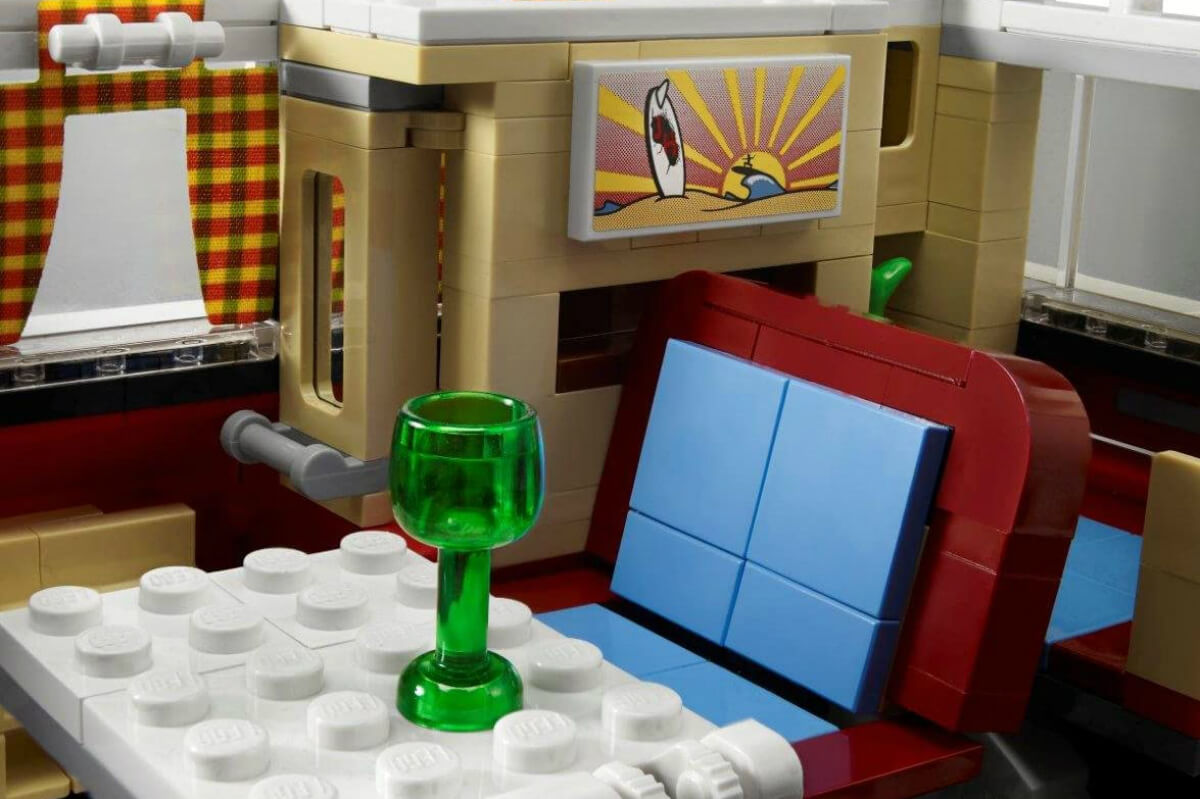 Compuesta por 1.334 piezas, la Volkswagen California de Lego mide 30 centímetros de largo y 16 de alto. La carrocería está recreada con todo lujo de detalles: en la parte delantera es reconocible el diseño en forma de ‘V’ a tres colores o el parabrisas dividido de tipo safari. El techo curvo es otra de sus características reconocibles y, además, se pueden abrir todas las puertas y el portón trasero. Eso sí, antes de pasar al interior hay otros detalles en los que merece la pena detenerse.
