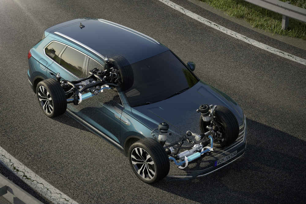 Otros elementos mecánicos a destacar son la suspensión neumática, la dirección activa a las cuatro ruedas, los estabilizadores electromecánicos y que el chasis esté fabricado en aluminio, lo que sumado al empleo general de materiales ligeros hace que el Volkswagen Touareg 2018 pese 106 kilos menos que el anterior.