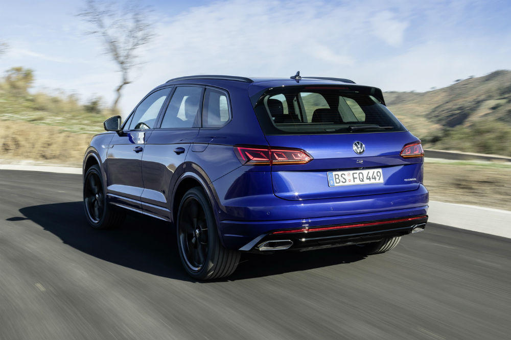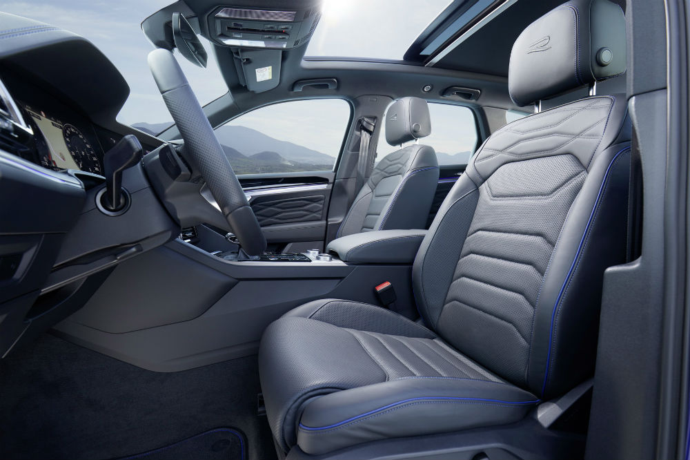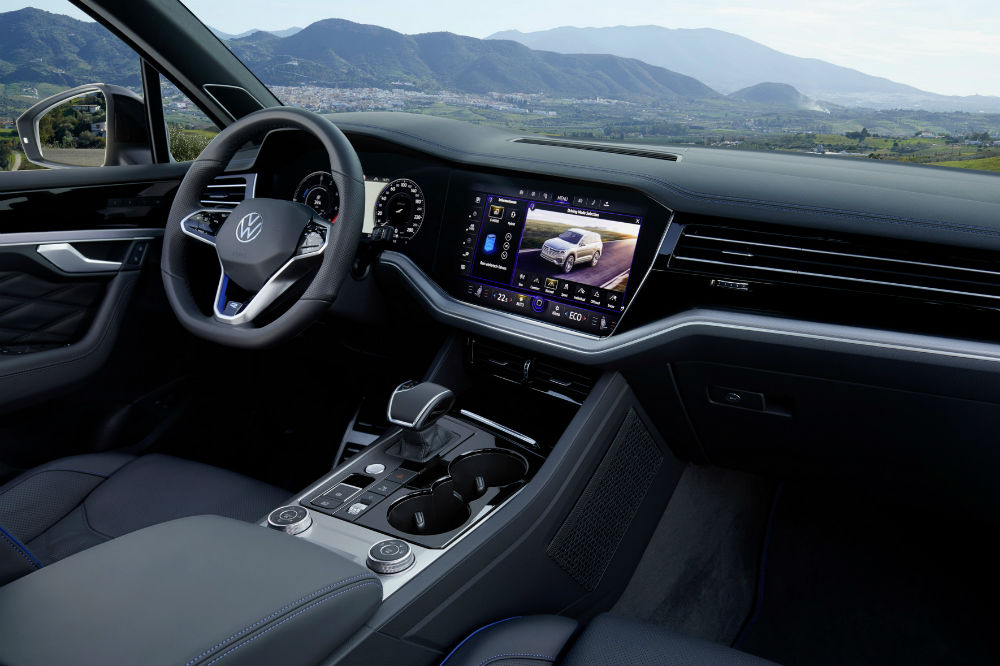 El habitáculo cuenta con asientos tapizados en cuero, que lucen costuras de contraste y la ‘R’ del apellido del Touareg; el volante está forrado el piel, los pedales son de aluminio y también los umbrales de las puertas, que además están retroiluminados. También tiene una dotación con toda la tecnología que puede ofrecer el SUV: pantalla de 15 pulgadas para la consola central, cuadro de instrumentos digital de 12, faros LED Matrix, climatizador de cuatro zonas, etc. Entre los extras opcionales se encuentra el Travel Assist, que mantiene al coche en el carril y guarda distancia de seguridad con otros vehículos a velocidades de hasta 250 km/h.