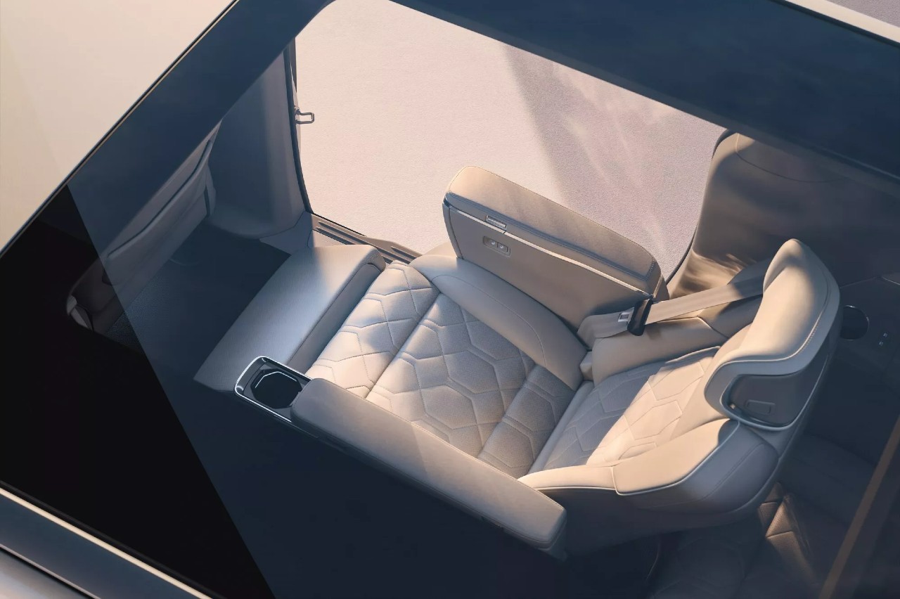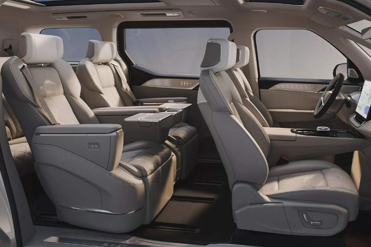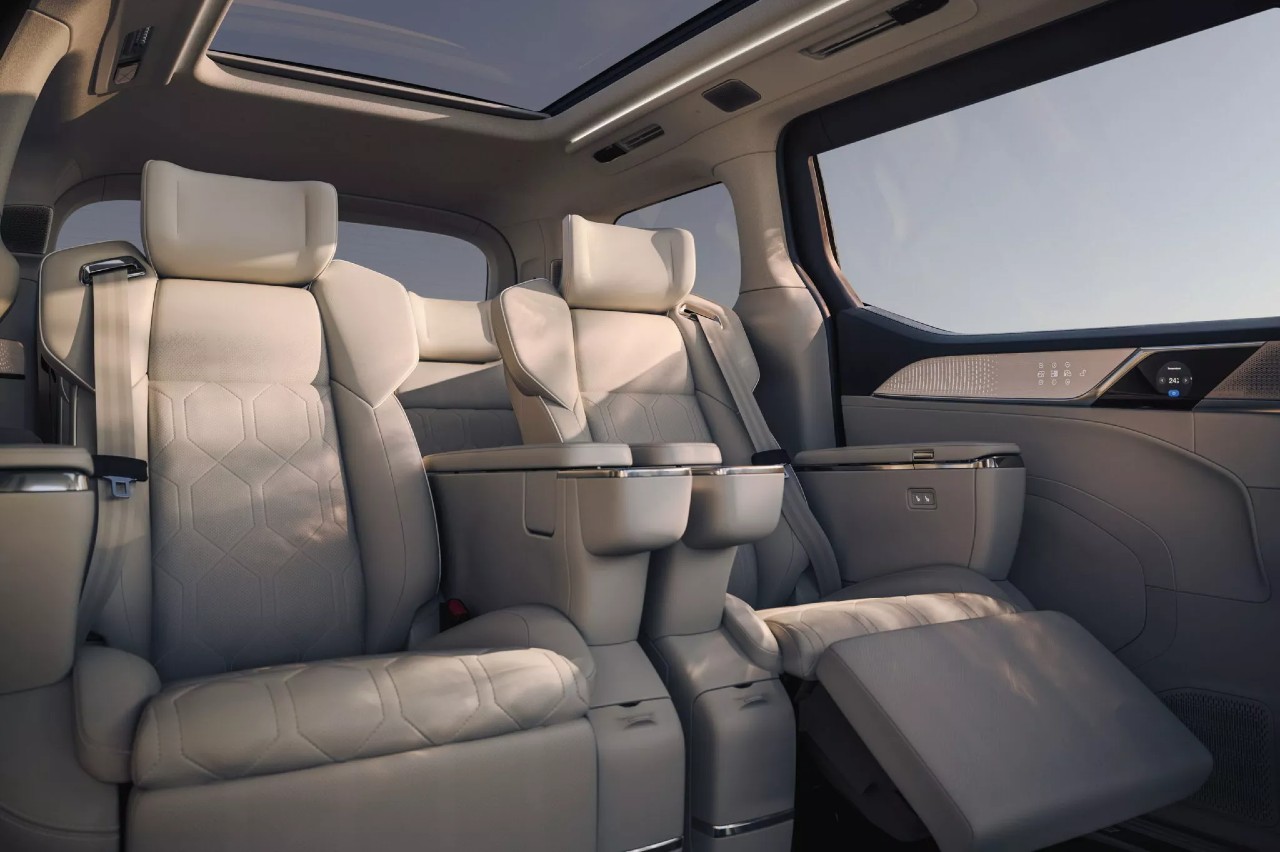 El habitáculo cuenta con una configuración de seis plazas individuales con butacas tipo business. El diseño es minimalista y muy despejado, con cuadro digital y pantalla central de 15,4 pulgadas, a lo que se suma otra de 15,6 pulgadas que baja del techo para las plazas traseras.
