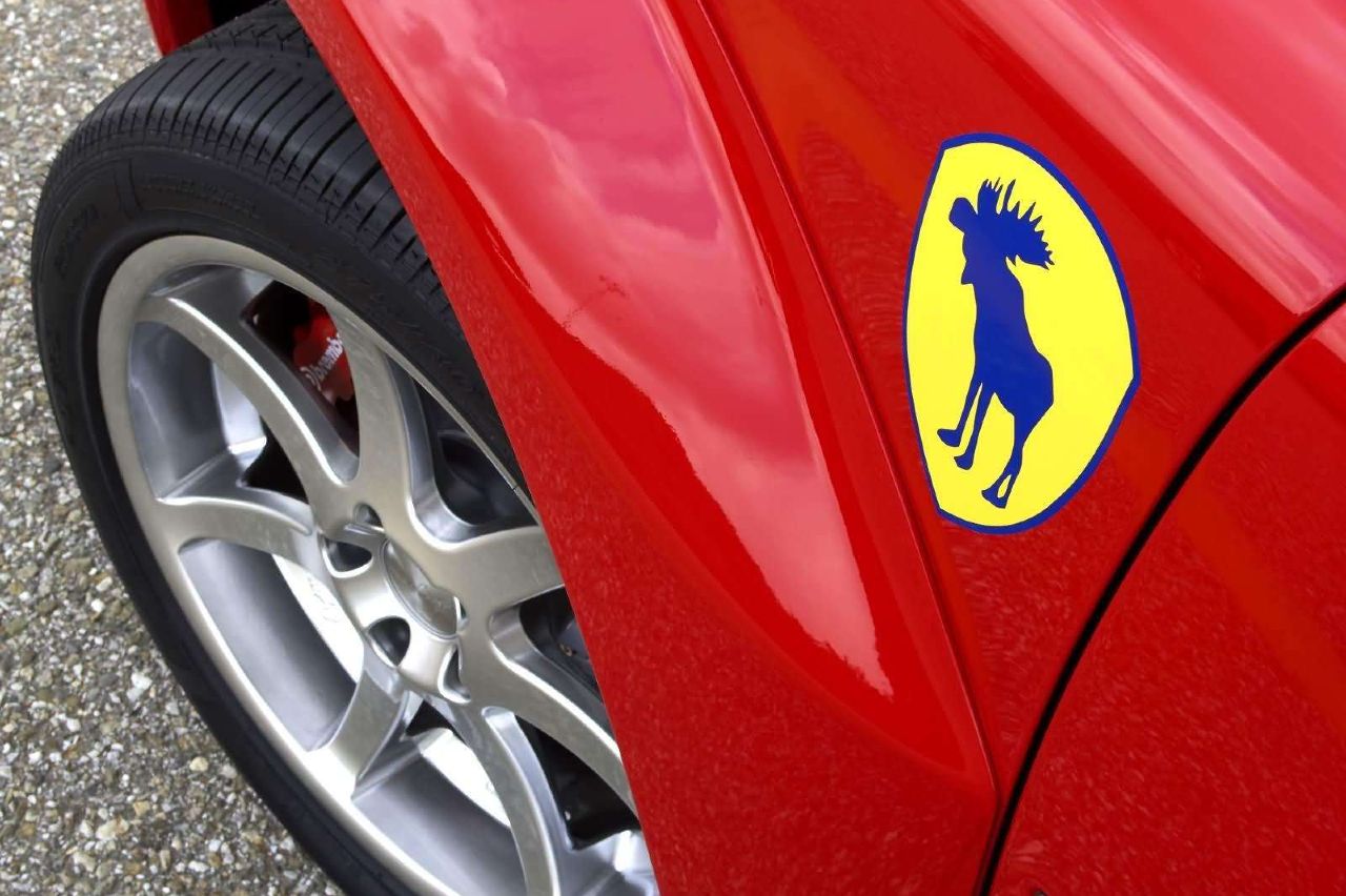 Hay que destacar el detalle del logo en la aleta delantera izquierda, un guiño a Ferrari, pues prácticamente copia el logo del fabricante italiano, pero reemplazando el ágil caballo por un más robusto alce.