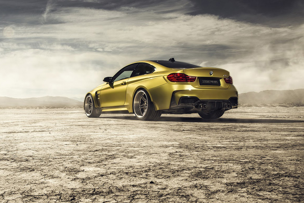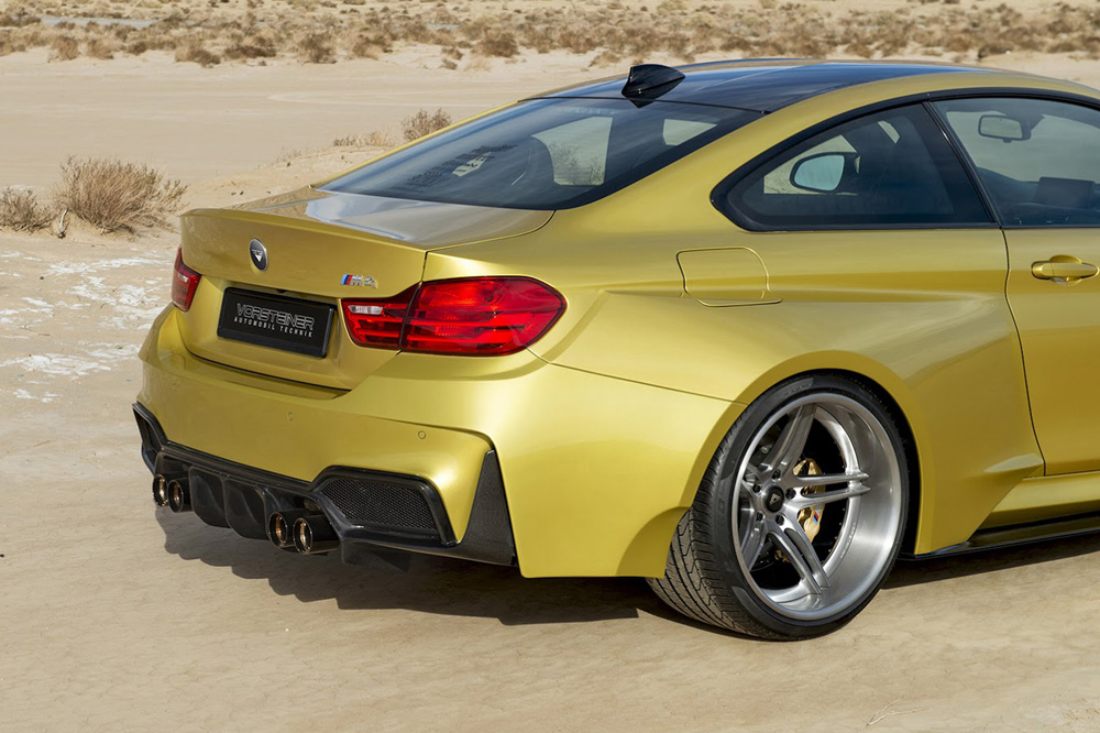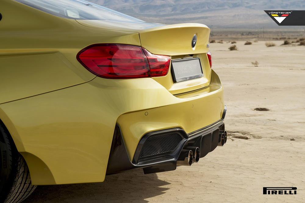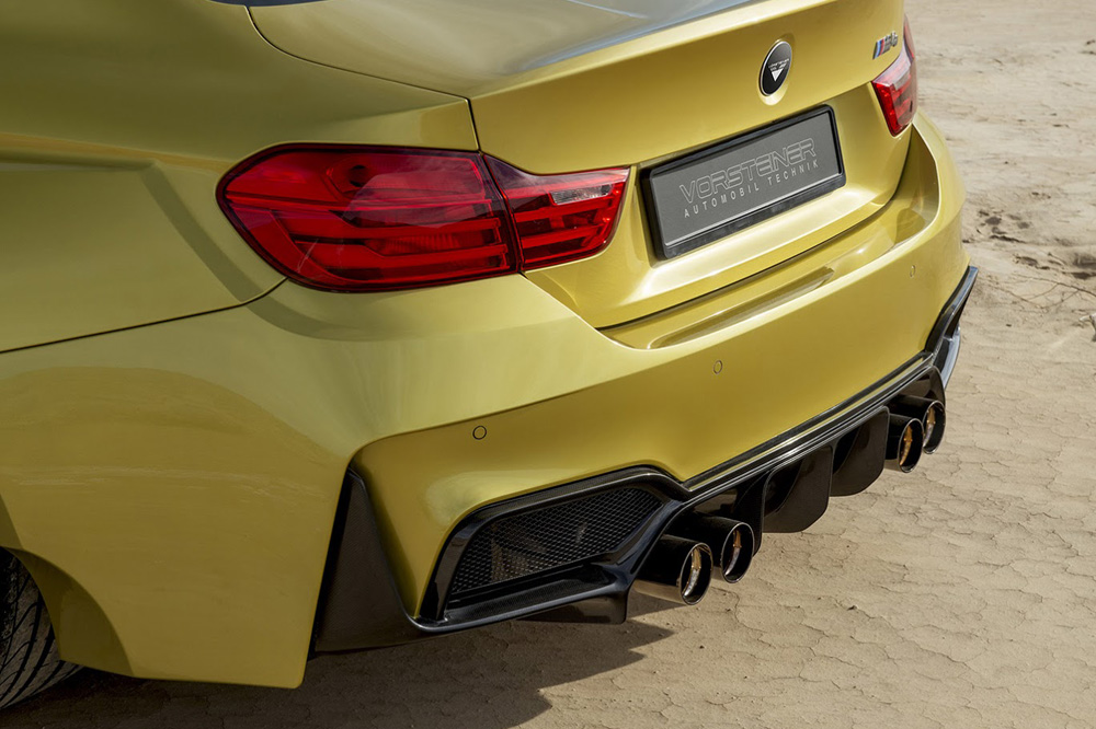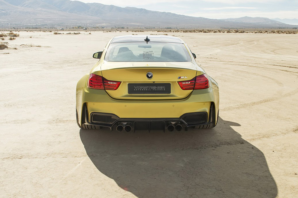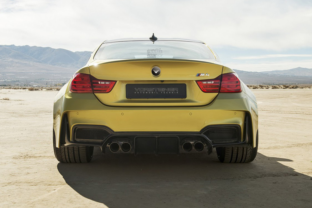 Pero quizá lo más llamativo del exterior del M4 Coupé GTRS4 de Vorsteiner sean las nuevas aletas. Las delanteras añaden nada menos que 10,16 centímetros de anchura -5,08 cm por cada lado-, mientras que las traseras han crecido a lo ancho nada menos que 17,78 centímetros -8,89 cm por cada lado-. Los cambios en el apartado estético se completan con una salida de escape cuádruple con tubos de 90 milímetros de diámetro acabados bien en negro diamante o en aluminio cepillado.