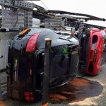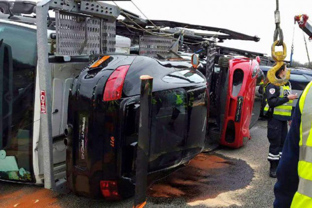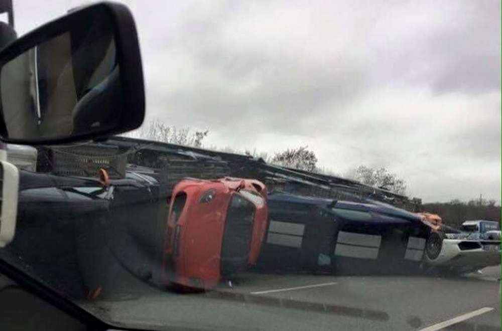 El accidente de un camión en Francia normalmente no sería noticia, pero como se trata de un camión que transportaba nueve superdeportivos, la cosa cambia. El vehículo pesado volcó en plena autopista dañando en el proceso los valiosos automóviles que llevaba en el remolque, entre los que podemos ver un par de Lamborghini Gallardo, un Ferrari F430, un Porsche 911 GT3 o un Shelby GT500.
