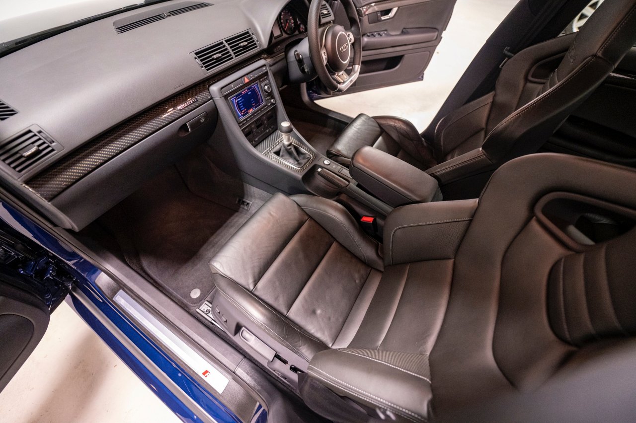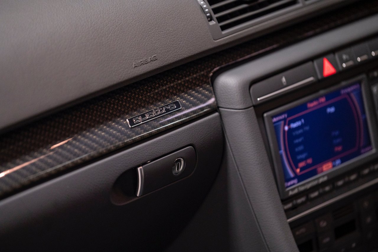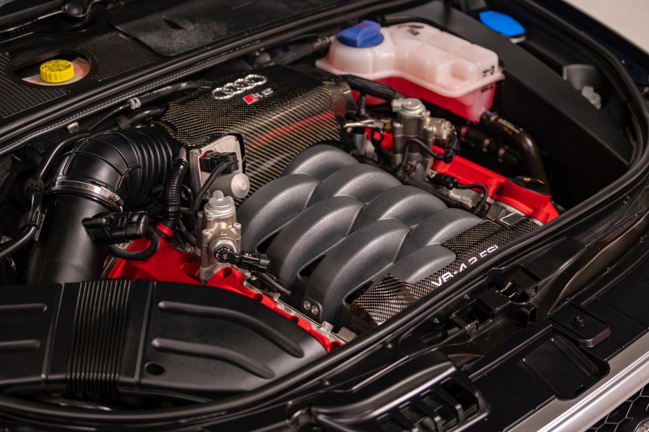 Este Audi está terminado en color Azul Mugello sobre un interior de cuero negro con asientos de tipo baquet, volante deportivo con fondo plano y molduras de carbono. Bajo el capó, un motor V8 FSI de 4.2 litros con 420 CV de potencia y 430 Nm de par, ligado a un cambio manual de seis velocidades y a un sistema de tracción total quattro.