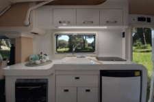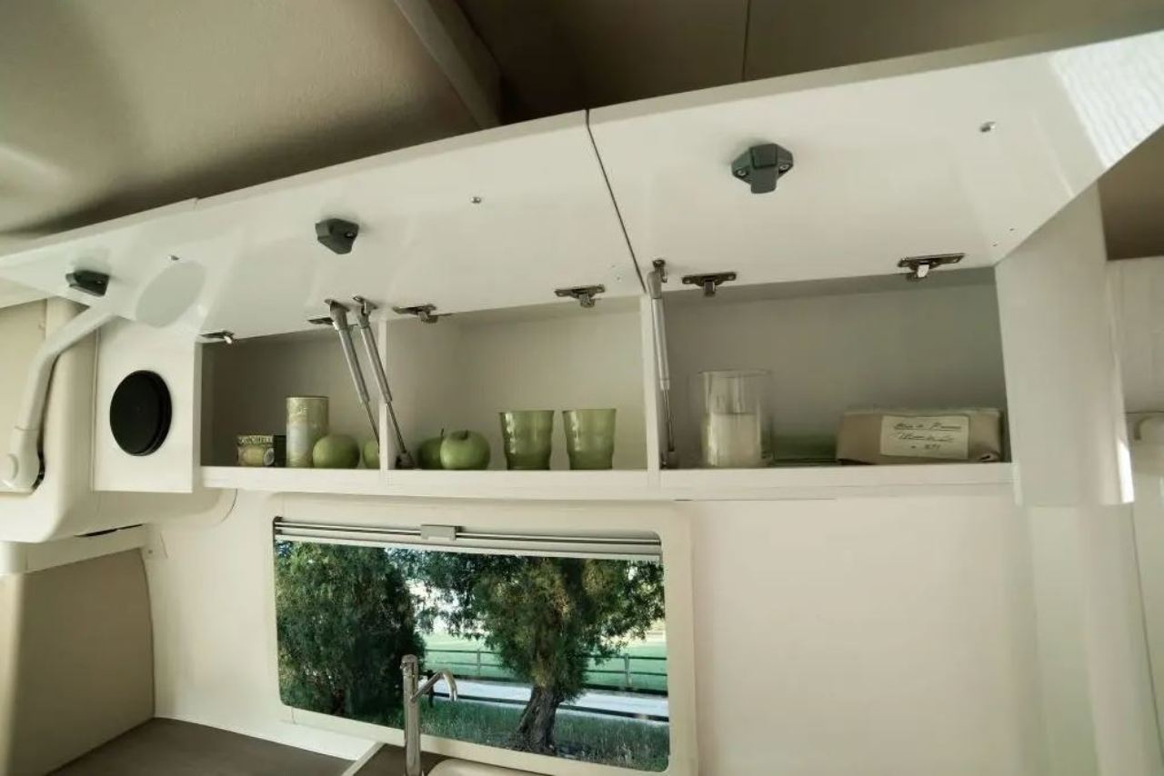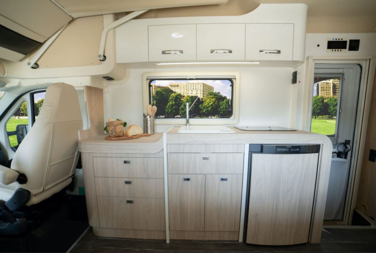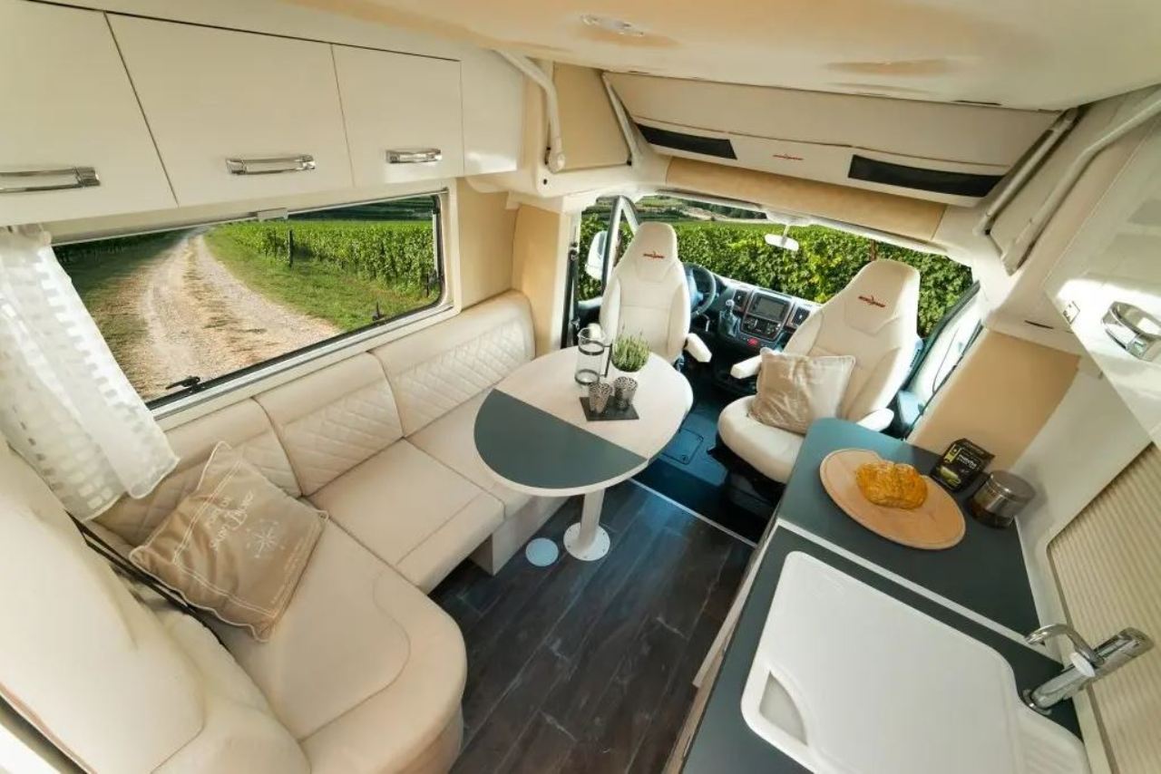 Los dos asientos delanteros giran sobre sí mismos para añadir dos plazas más a la zona de estar. En el interior pueden viajar hasta cuatro personas, que disfrutarán de un pequeño salón con mesa y una cocina equipada con frigorífico, fregador, encimera, horno y varios compartimentos para guardar objetos. En la parte superior también encontramos diferentes armarios que permiten ganar espacio de almacenaje.