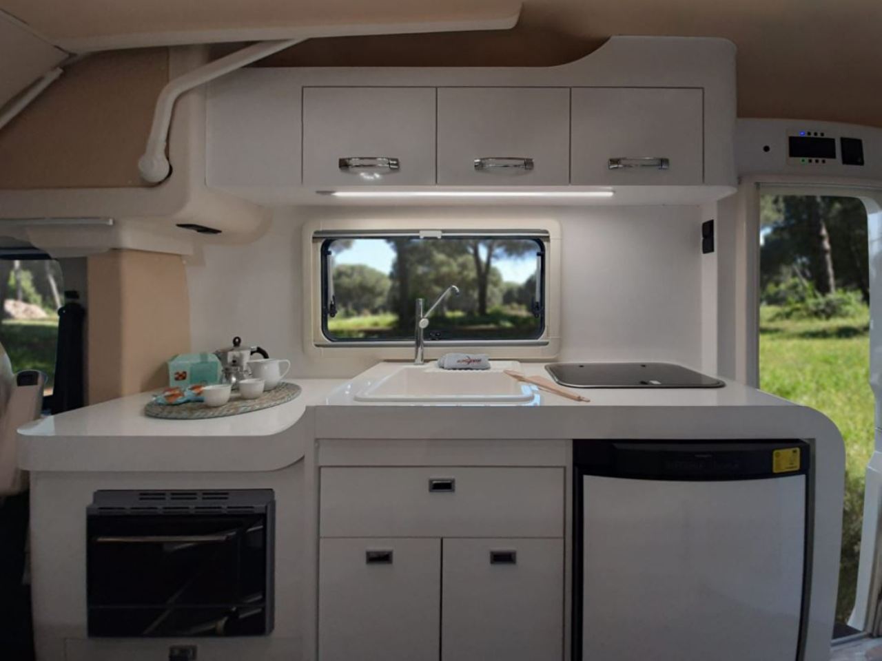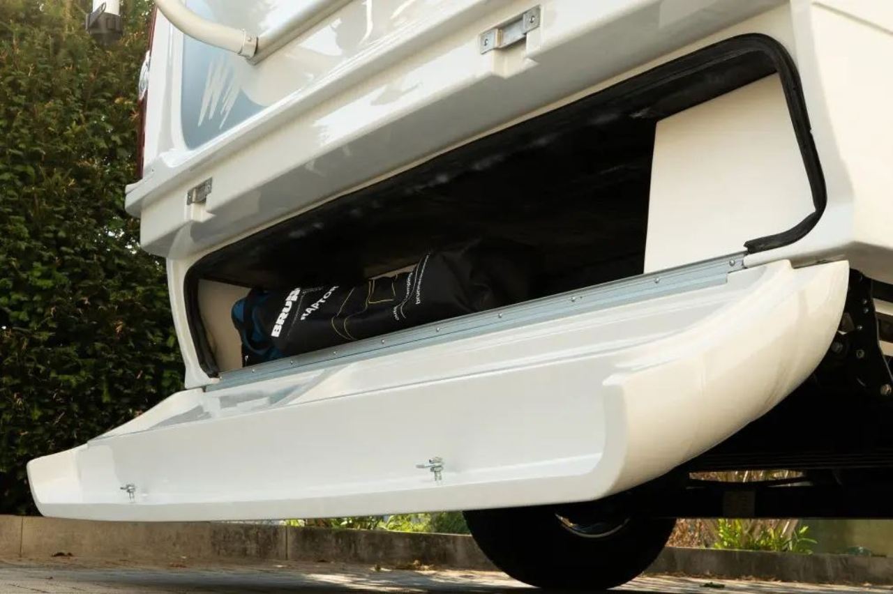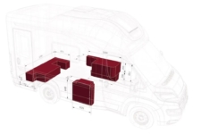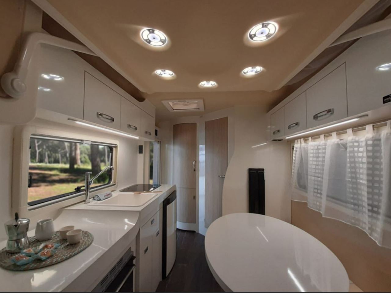 Los dos asientos delanteros giran sobre sí mismos para añadir dos plazas más a la zona de estar. En el interior pueden viajar hasta cuatro personas, que disfrutarán de un pequeño salón con mesa y una cocina equipada con frigorífico, fregador, encimera, horno y varios compartimentos para guardar objetos. En la parte superior también encontramos diferentes armarios que permiten ganar espacio de almacenaje.