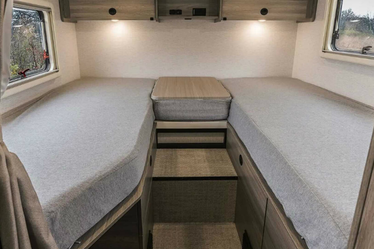 Esta caravana tiene capacidad para alojar a cuatro personas aunque para ello es necesario instalar el techo emergente que es opcional. De lo contrario, el Winnebago Ekko es perfecto para dos ocupantes. Está equipado con una cocina que cuenta con un combo de nevera y congelador, un par de fuegos y un fregadero que hace las veces de tabla de trabajo para preparar la comida.
