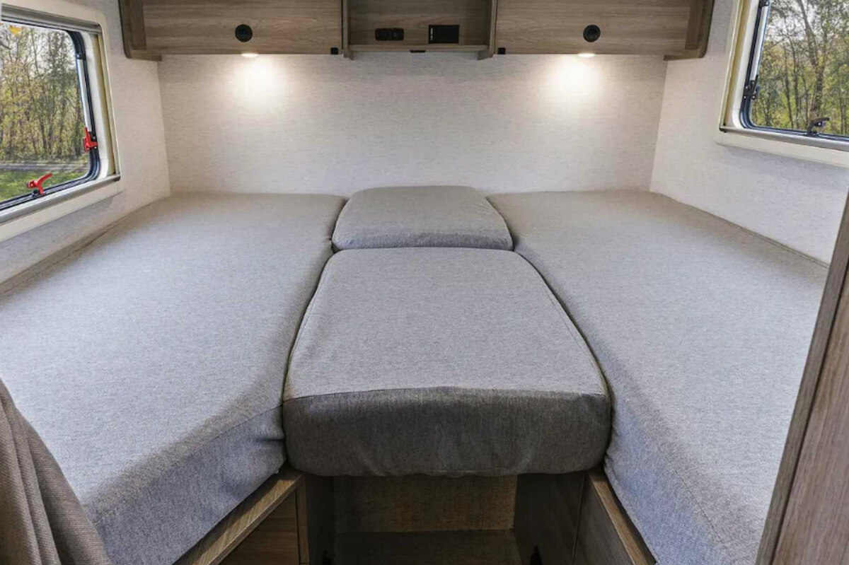 A la caravana no le falta espacio de almacenamiento. A todos los huecos que juegan al escondite hay que añadir un compartimento de almacenamiento aislado que ocupa todo el ancho de la parte trasera y es capaz de transportar varias bicicletas, esquís, tablas de surf y, en general, equipamiento de grandes dimensiones.