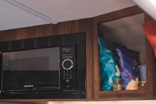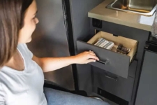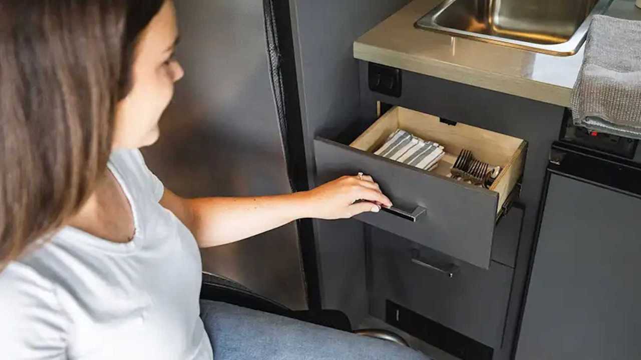 El fabricante se aseguró de que todo en el interior sea accesible incluso sentado, con bolsas de lona especiales para facilitar la carga y descarga. La cocina está diseñada teniendo en cuenta la accesibilidad, e incluye un frigorífico, microondas, fregadero y una toma de corriente para una placa de inducción.