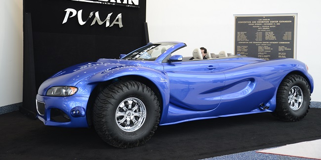En una esquina del Salón de Los Ángeles 2013, casi diríamos que escondido si no fuese por su colosal tamaño, encontramos al Youabian Puma. Este colosal descapotable de cuatro plazas mide nada menos que 6,15 metros de longitud y monta unos gigantescos neumáticos de 1,1 metros de altura y 53 centímetros de anchura. Puede que no parezca tan grande, pero sólo hay que fijarse en el tamaño de la persona que aparece sentada en el interior en la foto de portada para darse cuenta de las colosales proporciones del coche.