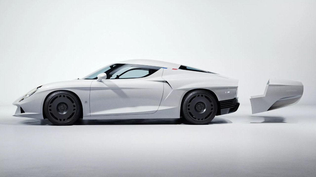 El resultado es de lo más llamativo, puesto que de base tiene una carrocería ‘longtail’, pero al desmontar la trasera (hecha de fibra de carbono) cambian sus proporciones y deja a la vista un paragolpes negro que modifica su carácter de manera considerable.